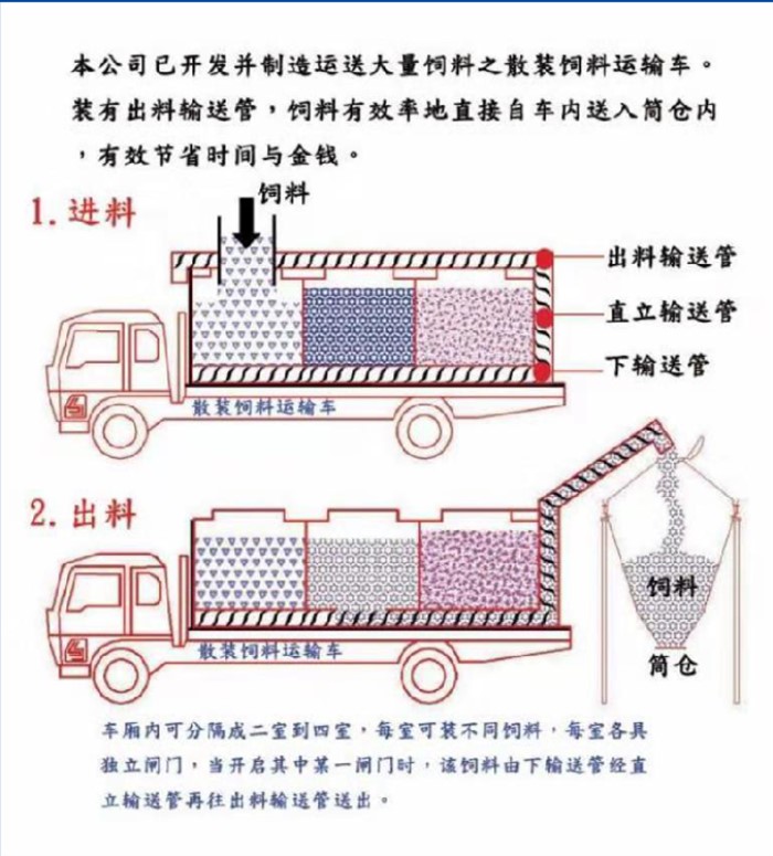上裝配置:罐體采用4mm優(yōu)質(zhì)鈦鋼板制作,罐體分為叁個(gè)倉(cāng)(可根據(jù)用戶需求做多個(gè)分倉(cāng)),可以各分倉(cāng)卸料順序和速度,整車3條絞龍(底部水平絞龍、尾部垂直絞龍、頂部舉升絞龍),由3個(gè)5.5kw 380v電機(jī)帶動(dòng)各絞龍工作,頂部絞龍液壓舉升,可左右旋轉(zhuǎn)180° 此車公告+環(huán)保+燃油齊全,全國(guó)上戶無(wú)憂!