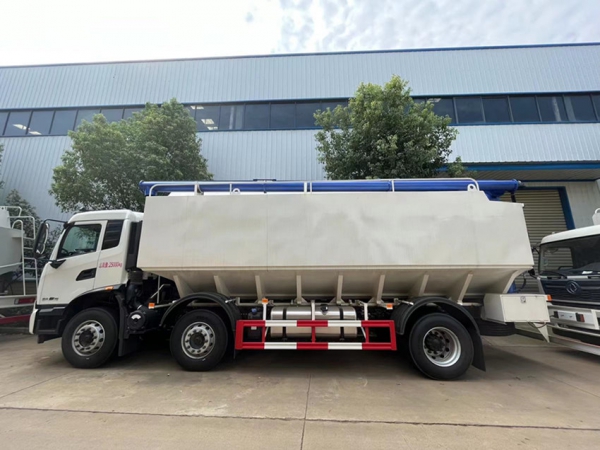 散裝飼料運輸車,散裝飼料車的飼料罐架設(shè)在卡車的底盤上,罐頂開有進(jìn)料口.頂部的一根螺旋輸送卸料管(俗稱卸料絞龍)則可自由回轉(zhuǎn)和抬升,抬升的仰角可達(dá)60度。運輸時,頂部的螺旋管平臥在罐頂;卸料時則抬起,使管端的出料口與畜禽飼養(yǎng)場貯料罐頂部的進(jìn)料門相接,駕駛室內(nèi)裝有操縱裝置(操縱裝置也可裝置在罐體尾部),卸料時通過車底的動力輸出軸和減速器來驅(qū)動螺旋,以完成卸料。